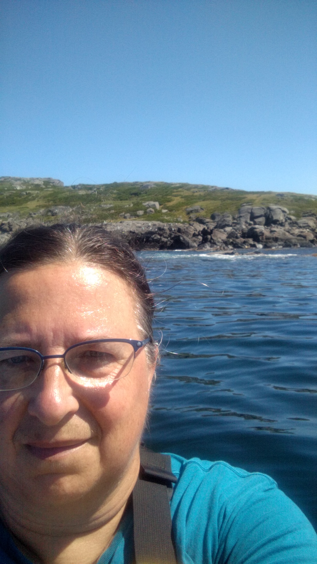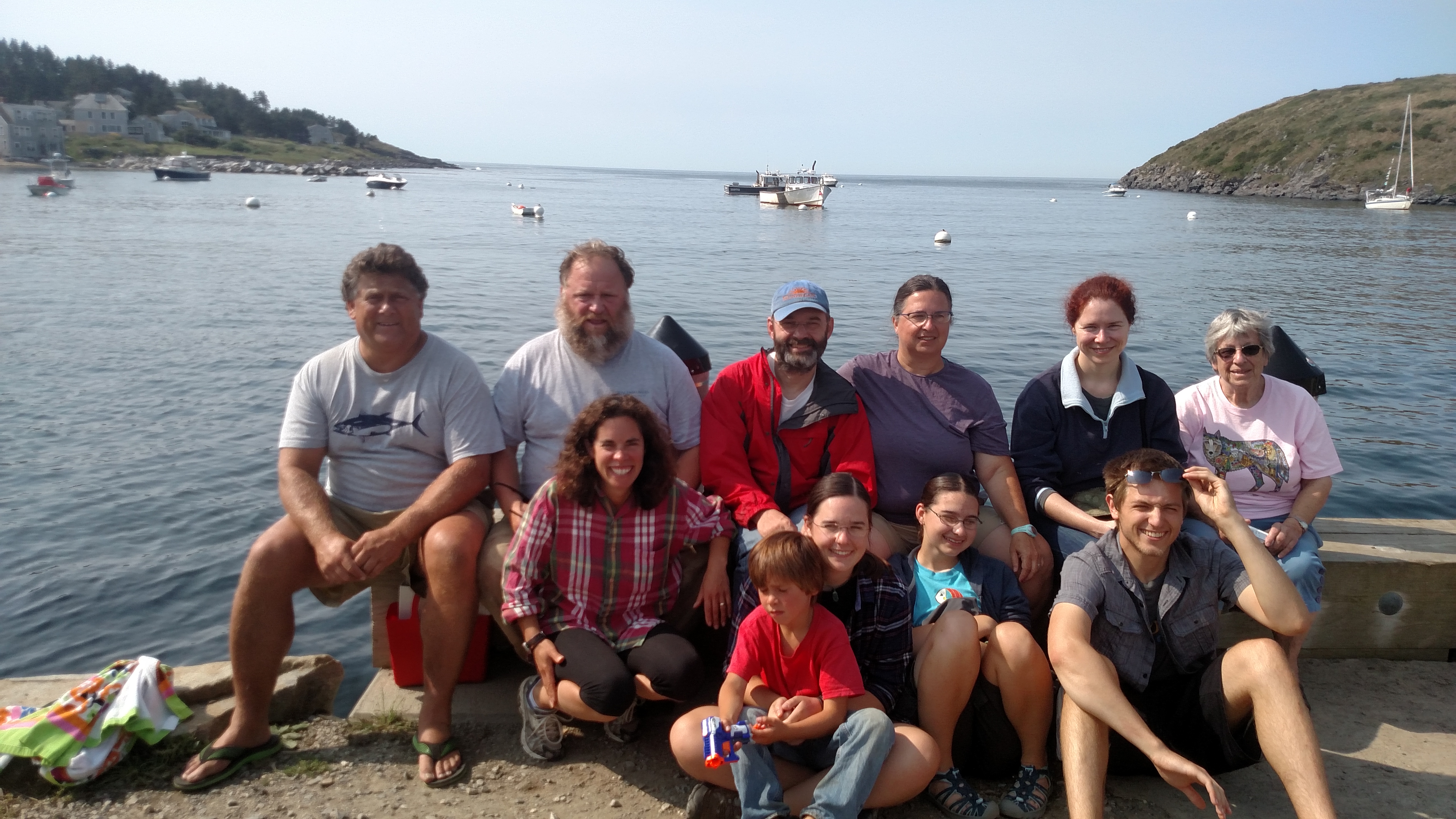 The selfie is me rowing in the Atlantic, one of my most favorite things ever. The group photo is my mother, her two children, plus their spouses and offspring (all my mom’s grandchildren in one place!) plus other important people who come along with us. We seem to be able to take one family photo on the dock before we all vanish to the various compass points of our existence. I have a couple more pictures taken on this very dock (someone else was occupying our usual rocks) spanning a decade.