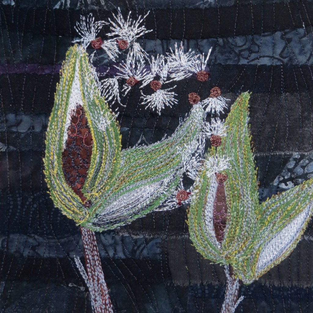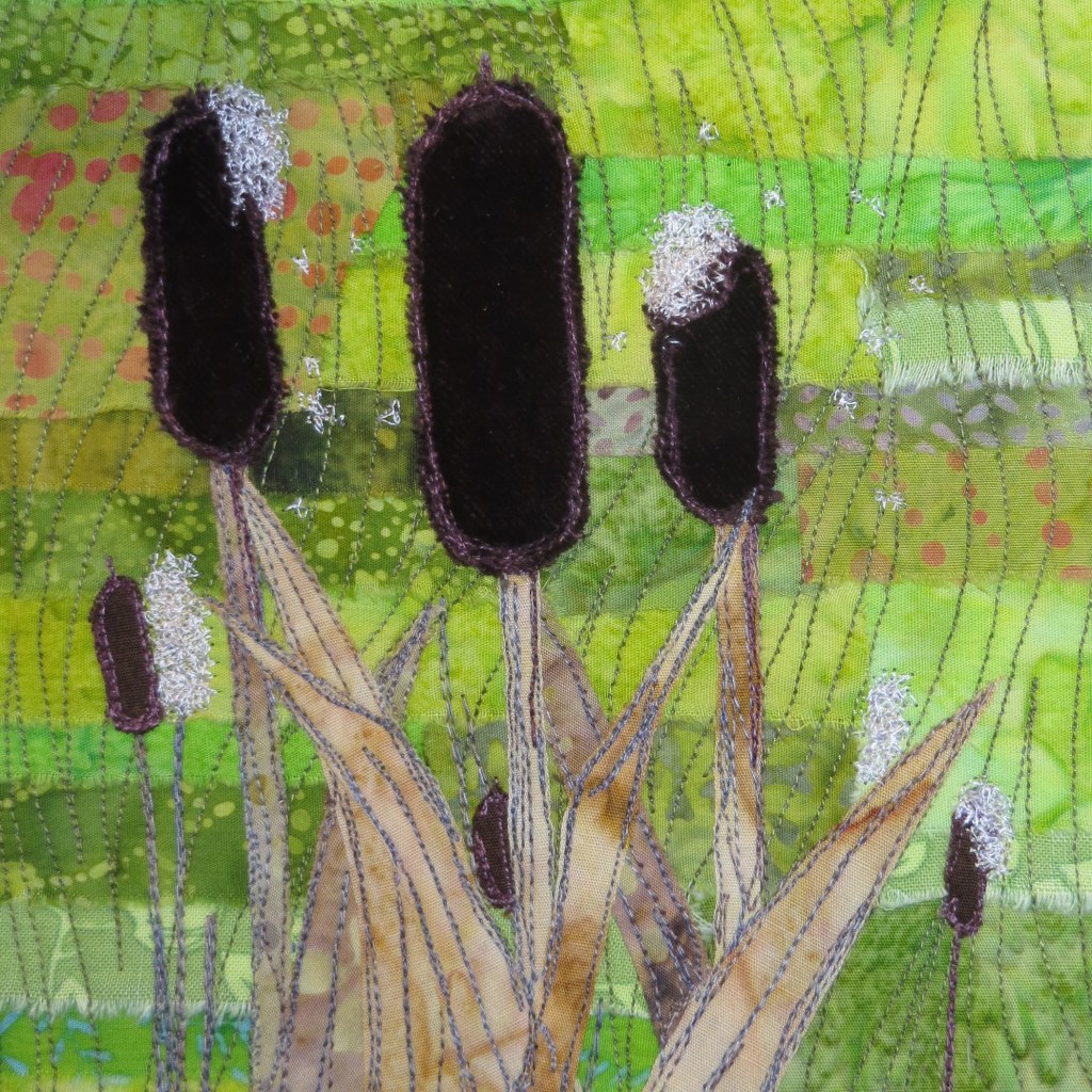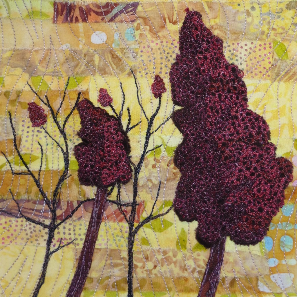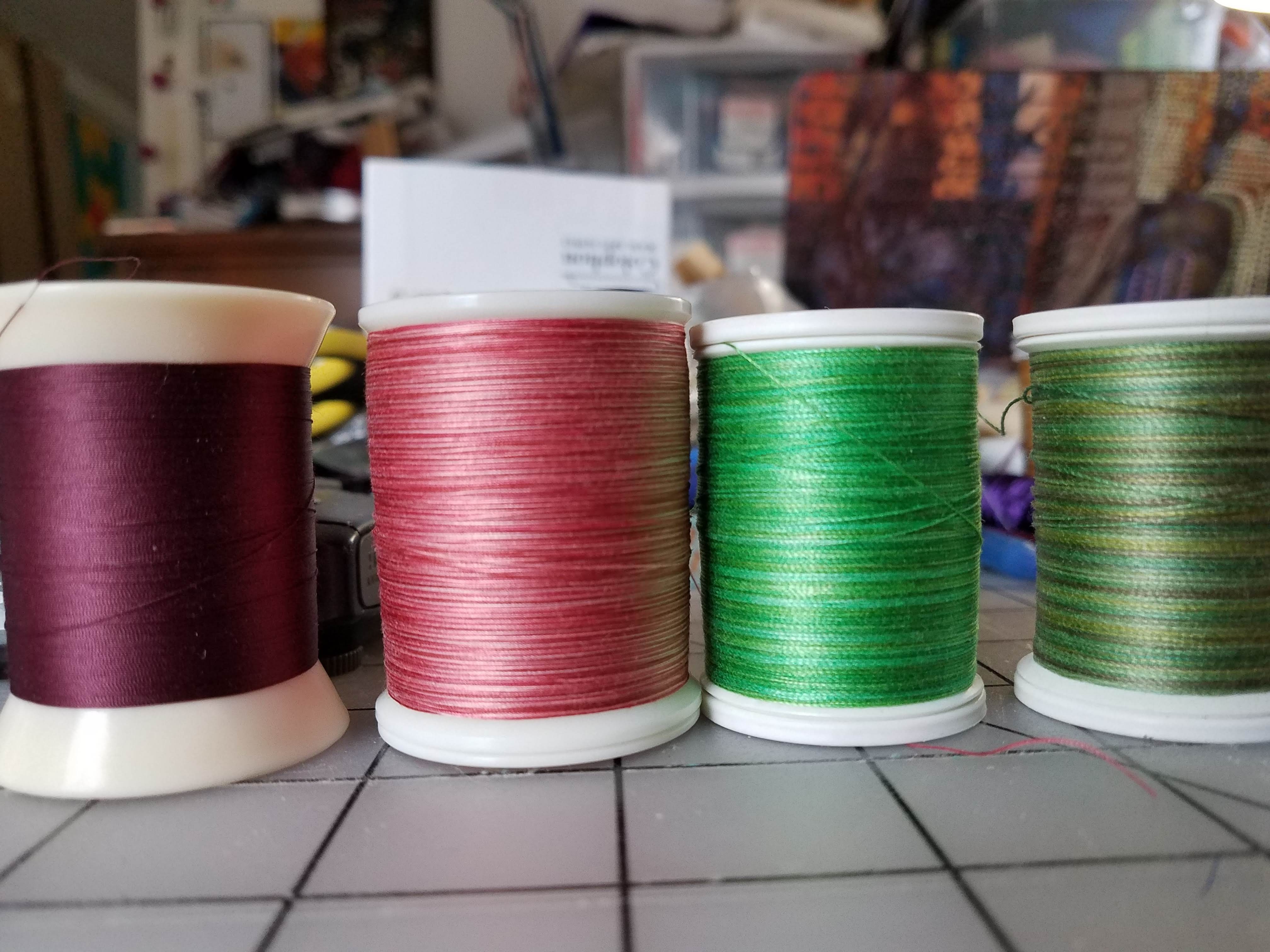 In a perfectly counter-intuitive move matched only by the wire industry, thread weights are inverse to the actual size of the thing in question. The 50wt thread on the left, from Superior, is the finest I tend to use because anything smaller than that does not cover the underlying fabric in any useful fashion. The weights increase to 40wt, also from Superior, 30wt, from Sulky, and 12wt from Sulky. All these are 100% cotton threads, and three of the four are also variegated threads.