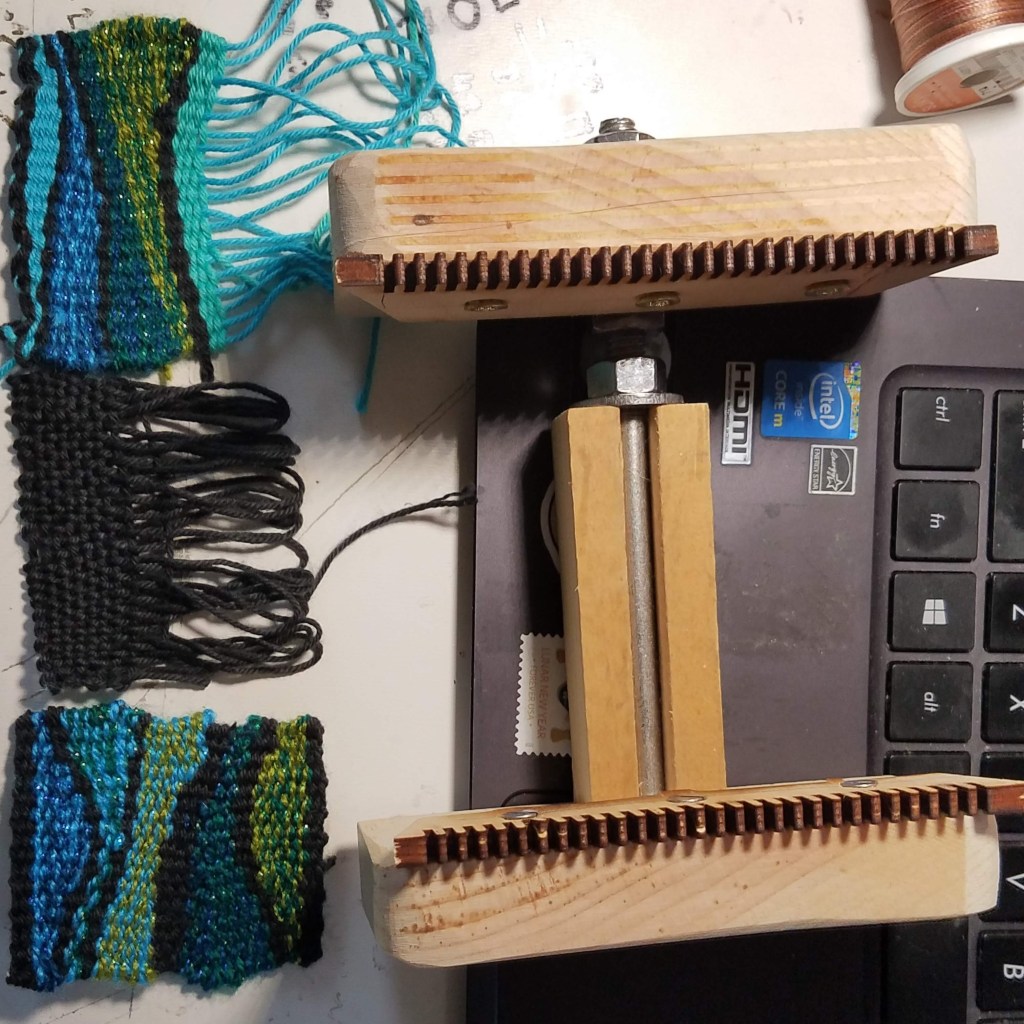 I think I need to take the teeth-combs off the inside faces of the blocks they are mounted on, and mount them parallel to the strings and facing out – so that tensioning the loom pulls threads more firmly onto the teeth rather than letting strings slip or get bumped off the top.