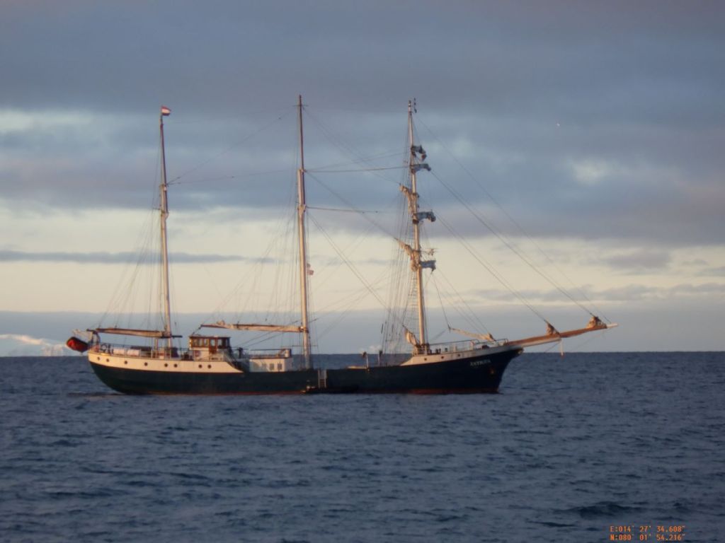 After that very blowy day the wind eased some over night, and the following morning we set off. Because the wind had blown us completely around we had to untangle the anchor chains, which required some clever use of the anchor winch. And we were off, wending our way down the fjord (Murchinsonfjorden) and out to the open ocean. The sky cleared some, and the sun was visible, and we raised some sails, and then opened up all four big square sails since we were going dead downwind, and we really sailed – turned off the engine and everything. It was GLORIOUS. The wind was still blowing hard, but only to produce a lot of whitecaps, not to peel the foam off the tops and hurl it about. Plus, we were going downwind, so there was less wind on us. The worst waves were from the stern, and they weren’t bad, so we just hammered along, sometimes exceeding nine knots. I don’t know if everyone was as thrilled as I was, but everyone looked really happy to be moving, to be doing things with the ship instead of thinking about work, to have the engine off and be going like that. As I might have said before, there were not many sailors in our group of artists. When we were talking about our applications and if we’d applied before, I allowed as how I’d applied several times, but was likely not accepted because my essays were basically “yes I make nice art, lemme on the BOAT!” which is not generally conducive to acceptance.