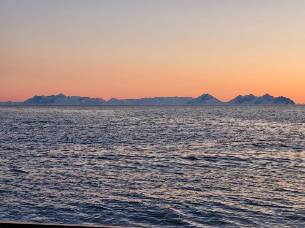 We stopped in another fjord further north, ringed around with tall peaks. I got up around 3am because I could see stars out of our porthole. Once on deck (swathed in my down coat) I could find the Big Dipper, and from there Polaris. It was wild to have to tilt my head so far back to see it – the difference between 80° off the horizon and zenith (directly overhead) is hard to see! I finally found Orion by waiting til his belt showed over the mountains (I never did see his feet) and from there located Procyon, and Aldebaran. While I was staring at stars, I was wondering what town was producing light pollution on the horizon, until I realized it was aurora. It was faint and flickery, but present and lovely in the cold night.