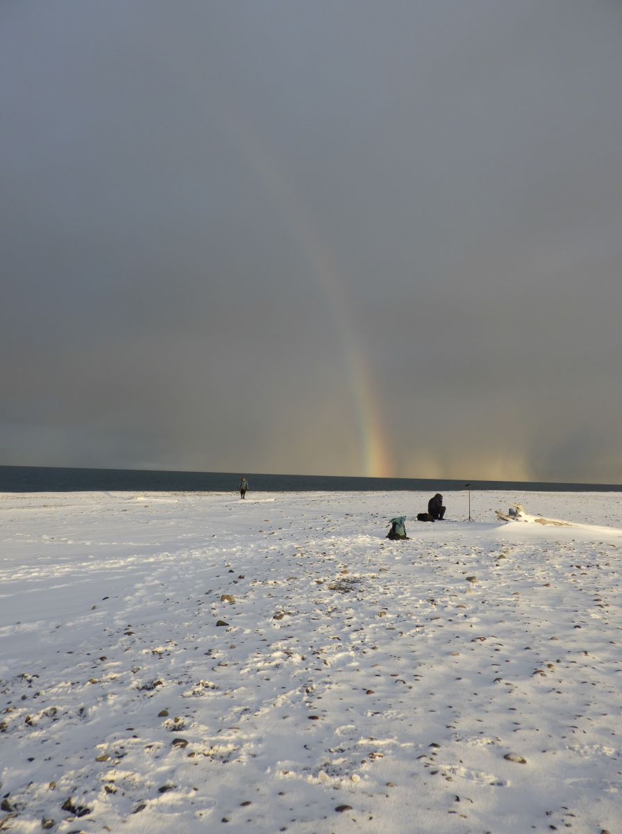 While we were there the sun came out from behind clouds in the south and shone across Moffen and towards the snowsqualls in the north, making a high faint rainbow in the snow. We weren’t sure what to call it – snow-bow, rainbow – but it was magical. I had the foolish thought that if I backed up far enough I could get it all into the camera view, but eventually decided it wouldn’t work quite that way.