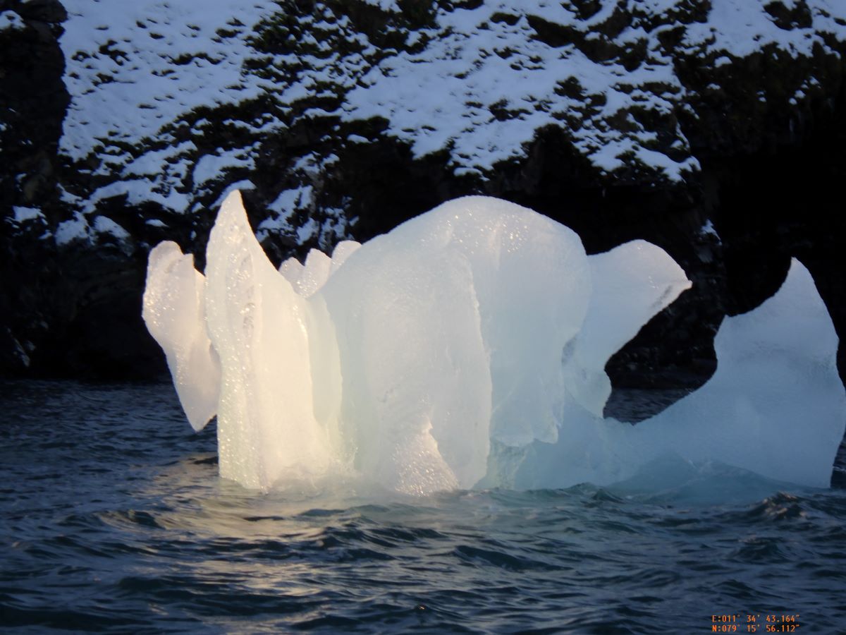 After that, I stayed in the zodiac with another performance artist who wanted to record some things in front of some of the floating ice. Just after we finished, the glacier calved While We Were Watching – a great chunk of it just plummeted into the ocean, in front of our eyes, with a plume of ice dust and a big wave radiating out from it. The zodiac surfed the wave easily, but a room sized piece of ice floating near by rolled over while we were watching, and then broke up into two big pieces and endless bergy bits. We were so stunned watching all this happen we were speechless, just sitting and looking at the ice and back at each other with our mouths hanging open in astonishment.
