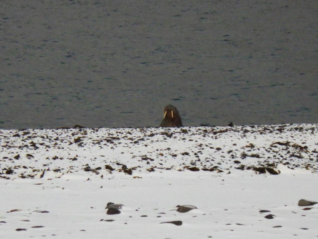 Once we had everyone aboard again we went north. Really, thoroughly NORTH. We went up over the top of the main island of Spitzbergen, and further north than that is a strange island that feels in the middle of the ocean. It is actually part of a large delta, from several large glaciers melting back a lot (not in human history, before that). It is a funny low, round island with a pond in the middle, so it is shaped like a low flat donut, composed entirely of rounded stones between head sized and sandgrains. It is where walruses breed, so it is closed to everyone during breeding season, but we were slightly less than a week past breeding season, so we went closer, to find a place to anchor. In circumnavigating Moffen Island we found a large group of walruses (herd, pod or haul are the usual collective nouns) hauled out on the beach, jostling each other like teenagers. We anchored slightly north, and everyone wanted to land. Once ashore, half of us went right, to see the walruses up close, because too many would be distracting, and the other half went left, to draw, take pictures or make performance art. We were as far north as we would get, there was nothing between us and the North Pole except 10° latitude of ocean and ice. It was beautiful, and desolate. While we were walking I kept lagging behind to look at all the small perfect stones, and one (possibly two – individuals were hard to ID) walrus(es) swam along the beach watching us. At one point one hauled himself partway up the beach, to peer over the berm. It was astonishing. The people who got closest to the haul of walruses at the other end of the beach said they were jostling each other constantly, and smelled of fish and farts.
